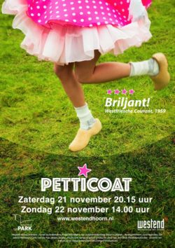 Op 21 en 22 november staat Westend weer op de planken van Schouwburg Het Park in Hoorn. Dit jaar met de spetterende, oer-Hollandse musical Petticoat! In deze wel heel bijzondere versie van Petticoat, droomt Pattie ervan een beroemde zangeres te worden. Ondanks protesten uit haar conservatieve familie vertrekt zij eind jaren ’50 naar Amsterdam om haar droom waar te maken. Daar ontdekt zij dat beroemd worden altijd een prijs heeft… Na het knallende succes van Ciske de Rat vorig jaar, heeft Stage Entertainment aan Westend de rechten gegeven om van Pattie een West-Fries meisje te maken, in plaats van een meisje uit Groningen. Een van de succesvolste Nederlandse producties krijgt hierdoor een West-Fries tintje.